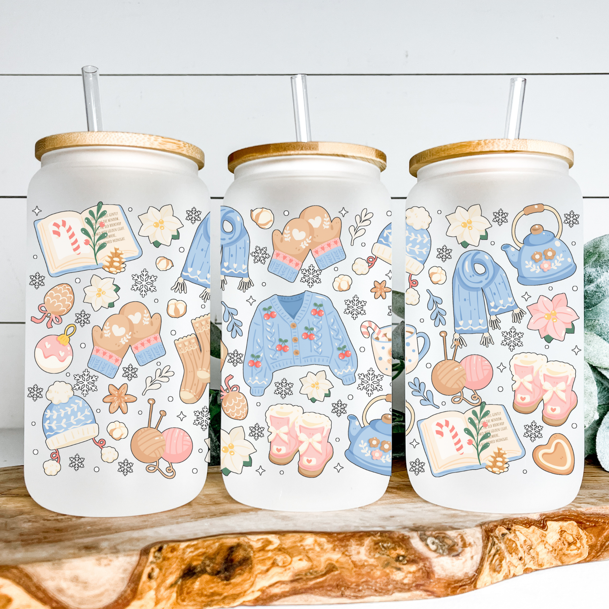 Frosted glass mug with blue Christmas sweater design